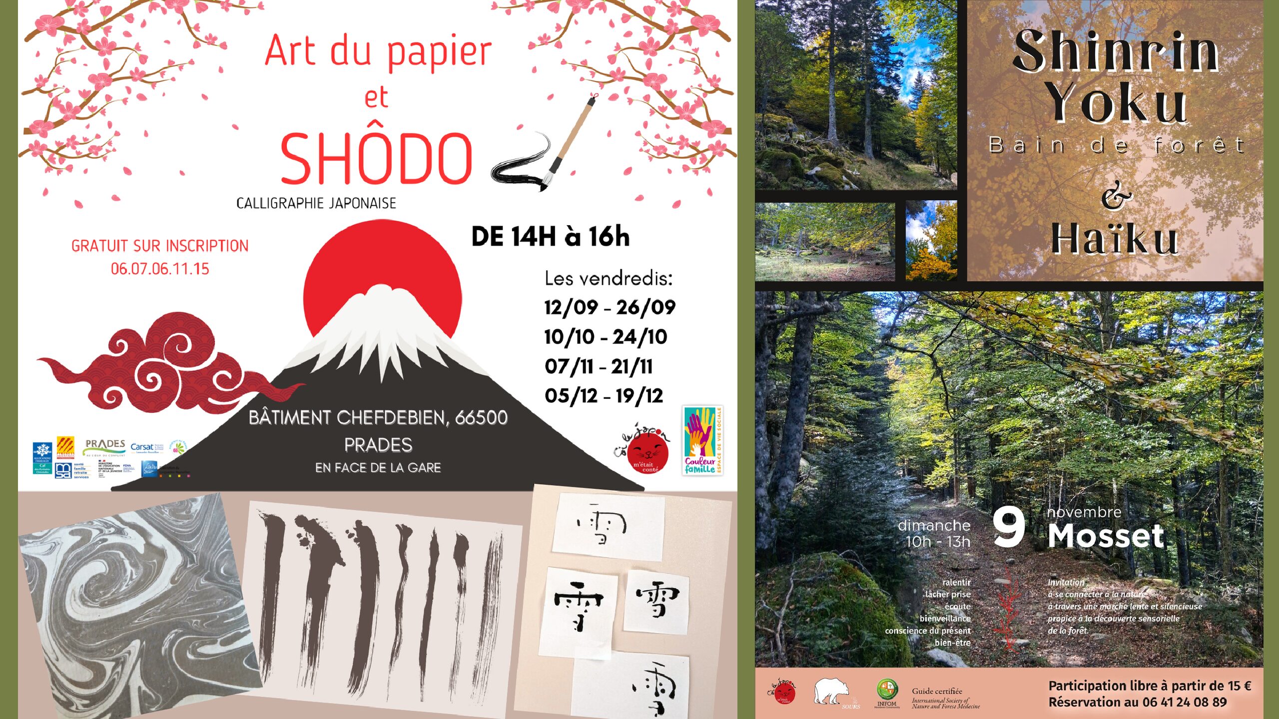 Dimanche 9 novembre 2025 à Mosset : Shinrin yoku (bain de forêt) et haïku, guidé par Carme de l’association Sours, dans le cadre de la Quinzaine du Japon en Occitanie. Venez découvrir cette discipline japonaise de connexion à la nature pour découvrir la forêt à travers les sens. Participation libre à partir de 15 euros par personne. Nombre de places limitées! Réservation : 06 41 24 08 89Carmeassociationsours@gmail.comhttp://associationsours.over-blog.com Ateliers créatifs avec Couleur Famille « Shodô, calligraphie japonaise » le vendredi 7 novembre 14h-16h « Art de papier japonais, Suminagashi (papier marbré avec de l’encre) » le vendredi 21 novembre 14h-16h GratuitRéservation : Couleur Famille