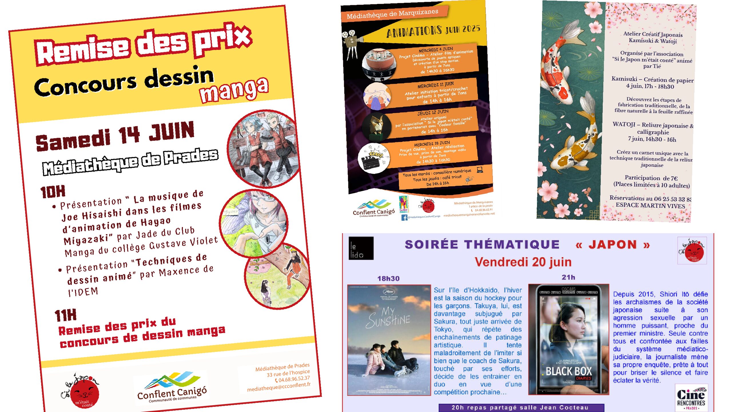 La remise des prix du concours dessin manga Samedi 14 juin à la médiathèque de Prades 10h Présentation de la musique de Ghibli par Jade du Club Manga du collège Gustave Violet (15 mins) suivie d’une mini conférence sur les techniques de dessin animé par Maxence, un élève de l’IDEM, animation 2D (30 mins). 11h Remise des prix du concours de dessin manga La soirée ciné japonais avec les Ciné-rencontres au cinéma le Lido Le vendredi 20 juin18h30 « My Sunshine » de Hiroshi Okuyama 20h repas partagé, tiré du sac, salle Jean Cocteau 21h « Black Box Diaries » de Shiori Itō Les