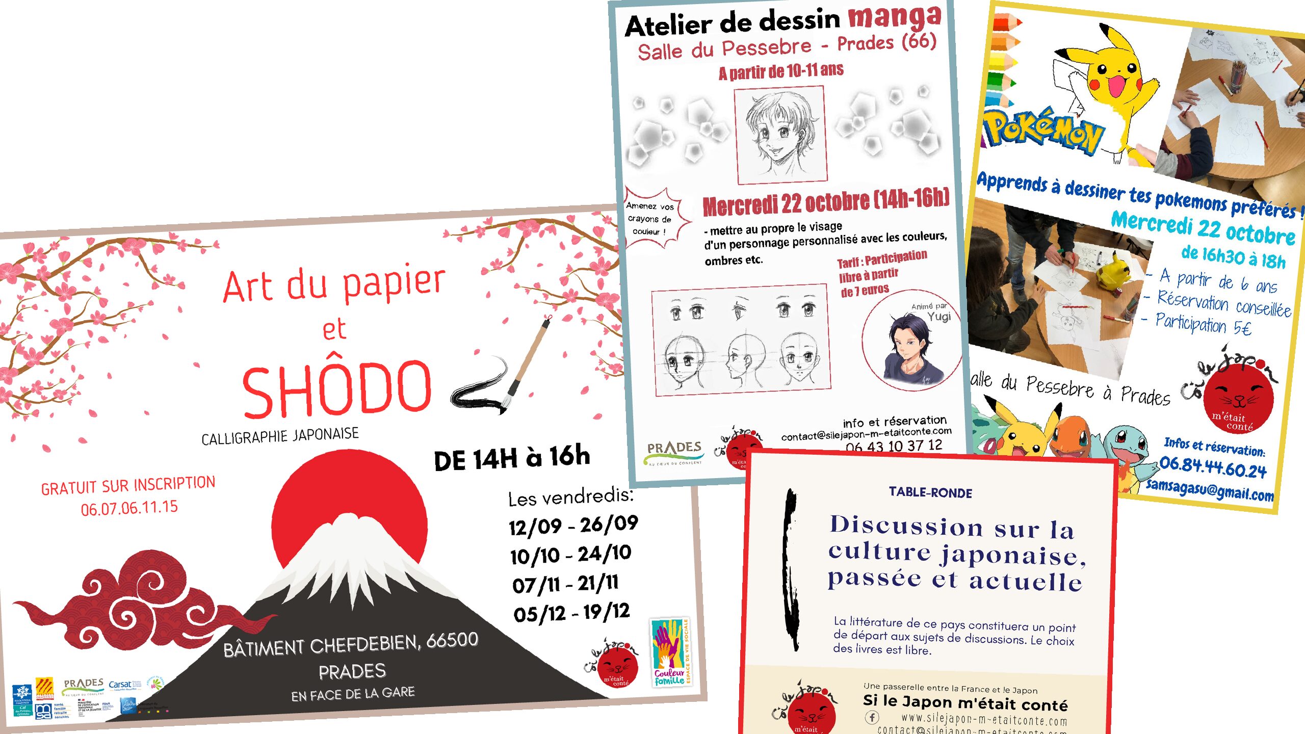 Avec Couleur Famille Ateliers créatifs avec Couleur Famille « Shodô, calligraphie japonaise » le vendredi 10 octobre 14h-16h  « Art de papier japonais, Orizomé (teinture sur papier) » le vendredi 24 octobre 14h-16h GratuitRéservation : Couleur Famille  : 06 07 06 11 15 Pendant les vacances de Toussaint Atelier dessin manga de YugiMercredi 22 octobre 14h-16h à la salle Pessebre à Prades: Mettre au propre le visage d’un personnage personnalisé avec les couleurs, ombres etc. À partir de 10-11 ansTarif : Participation libre à partir de 7 € par coursInfos et Résa : 06 43 10 37 12 Atelier dessin Pokémon de SamuelMercredis 22 octobre